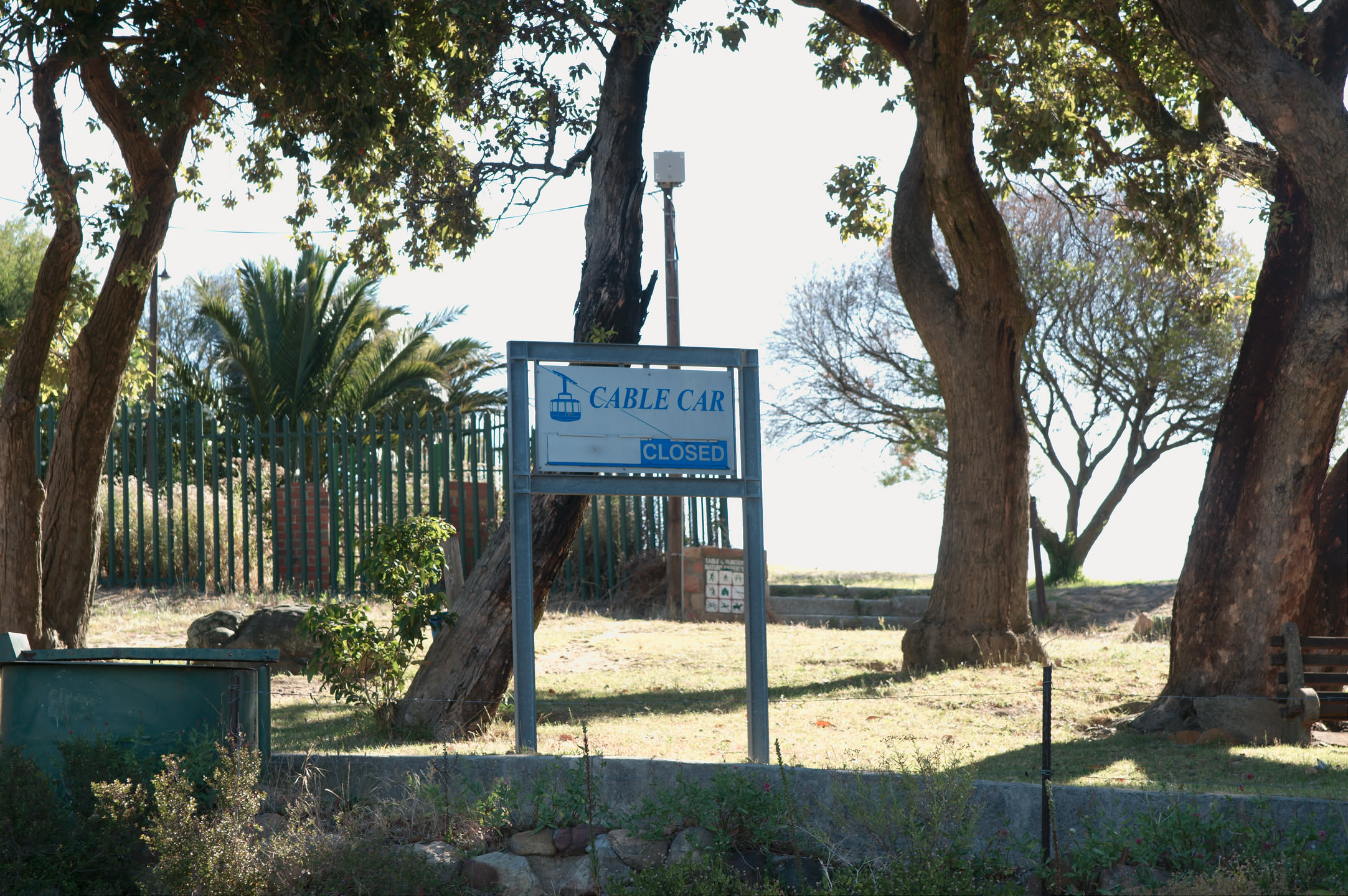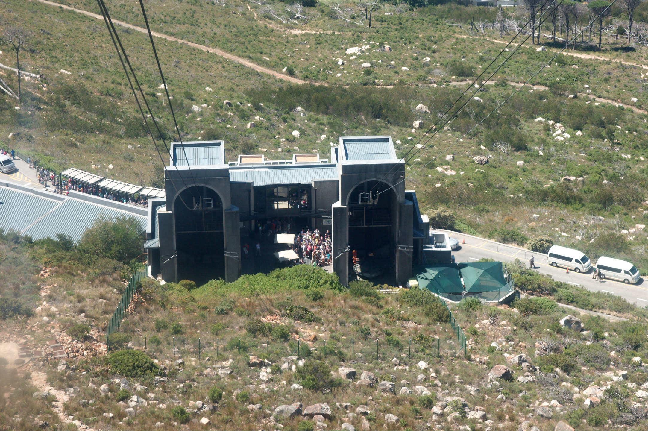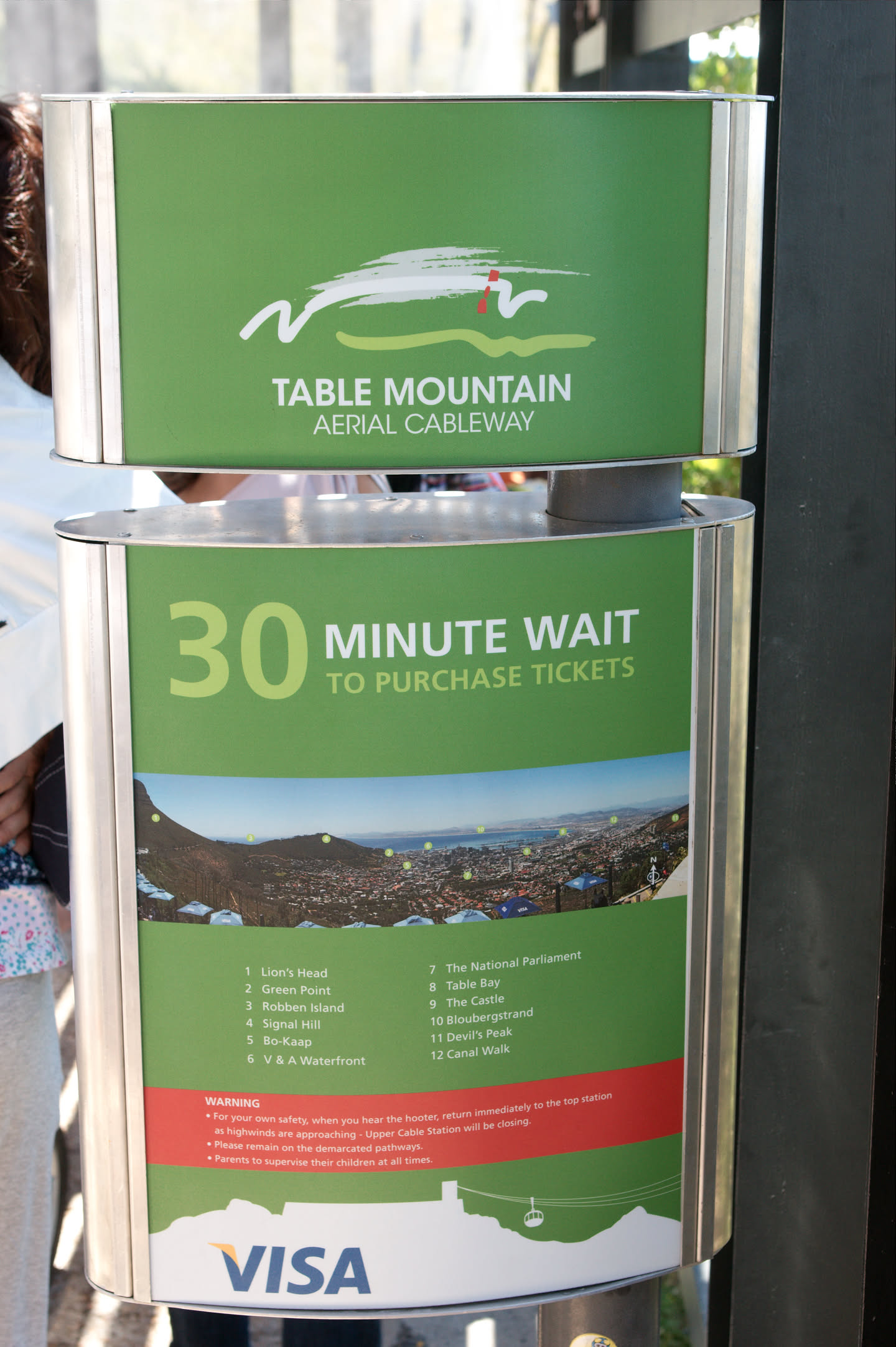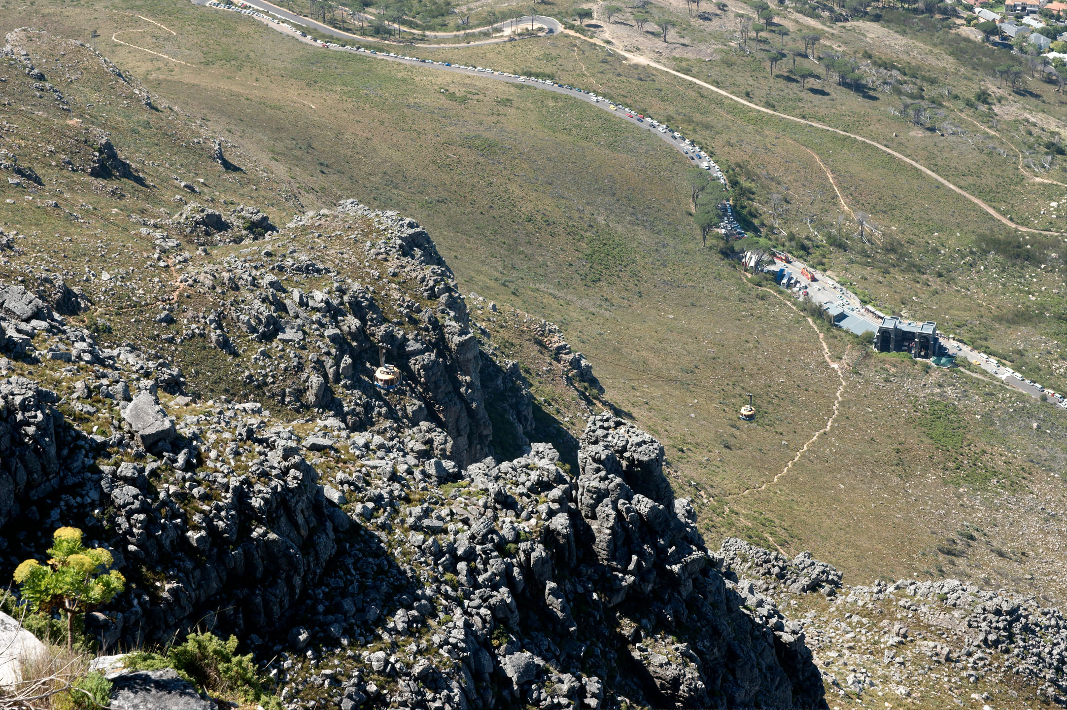 Op driekwart van de route schrikken we: er staat een bordje dat de kabelbaan gesloten is! Shit, eerst Robbeneiland, en nu dit. We staan even te kijken met wat andere mensen en dan zien we plotseling toch een gondel van de kabelbaan bewegen. Gelukkig.