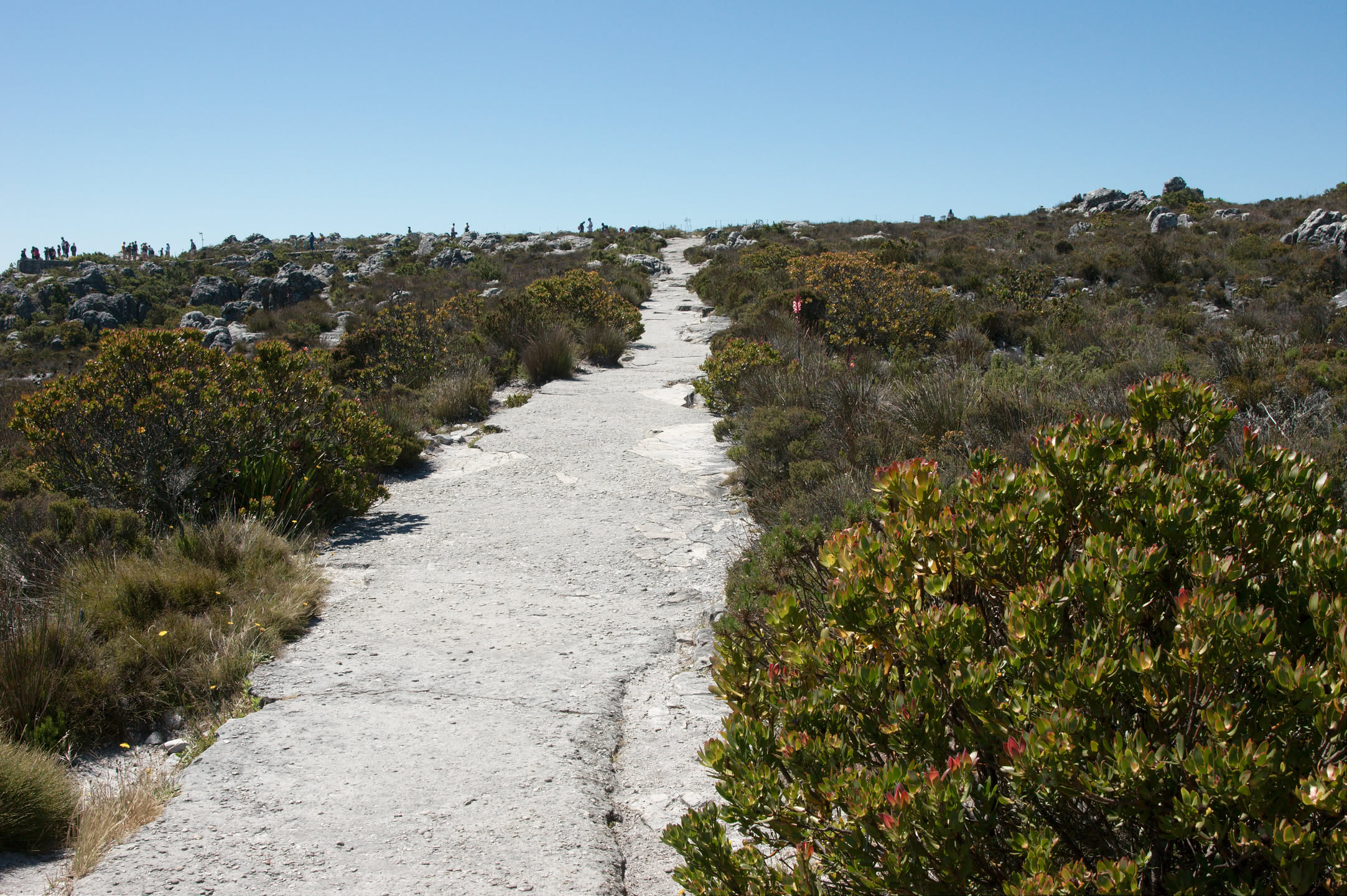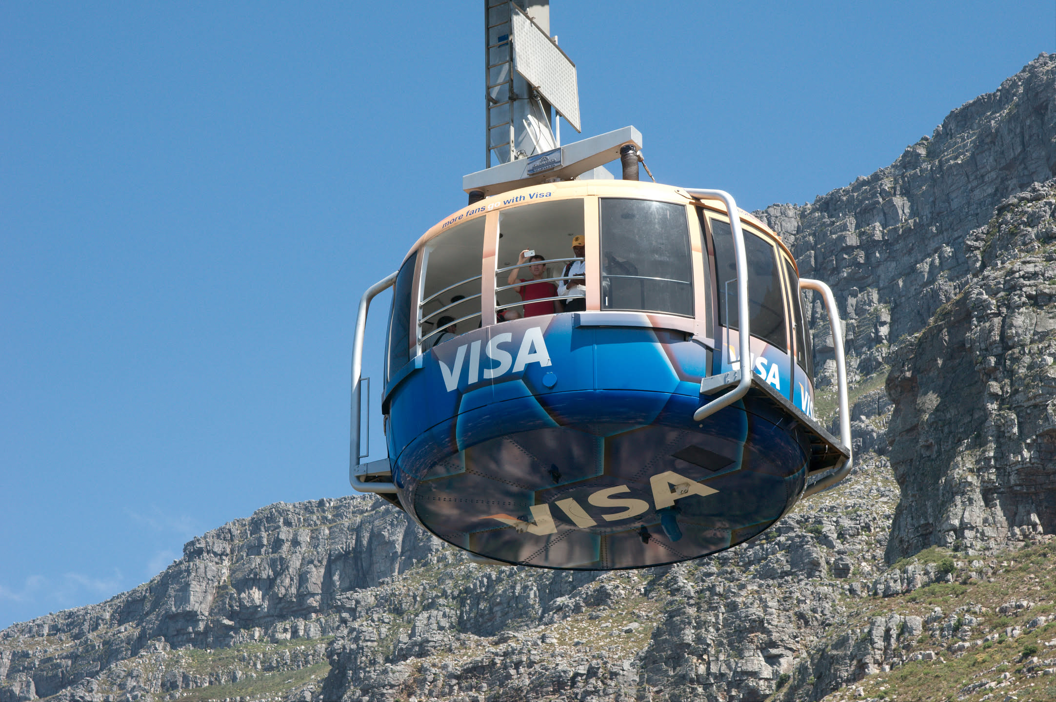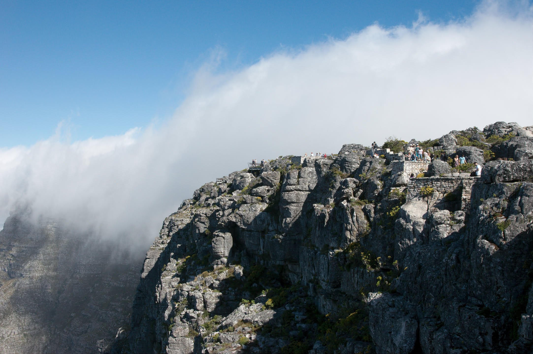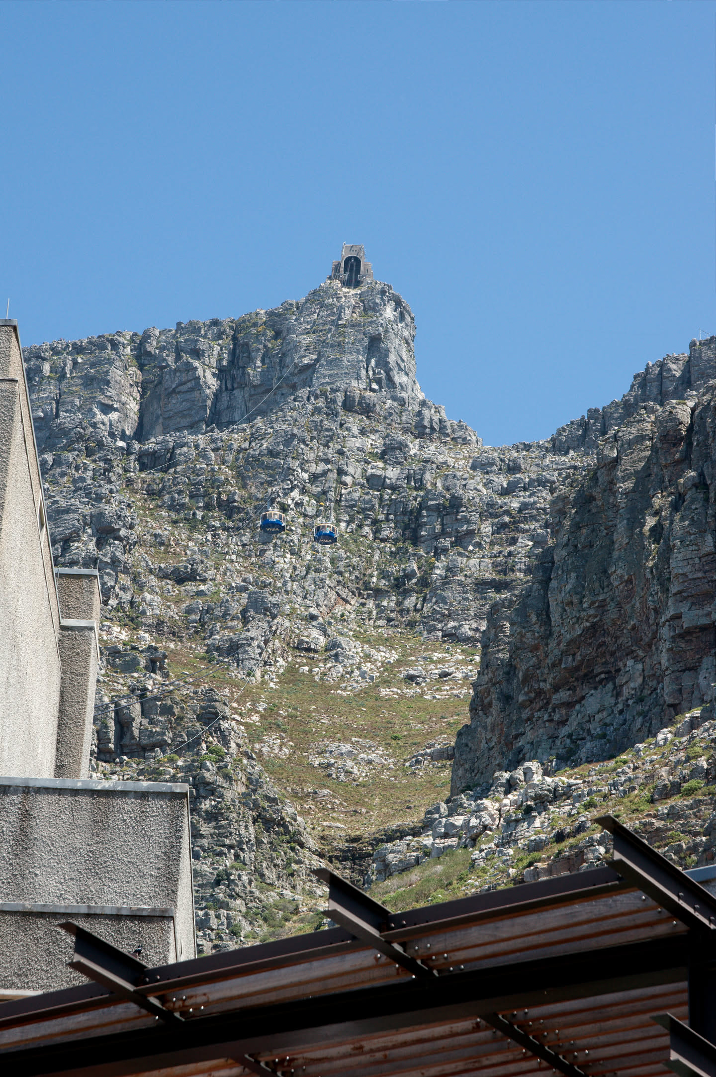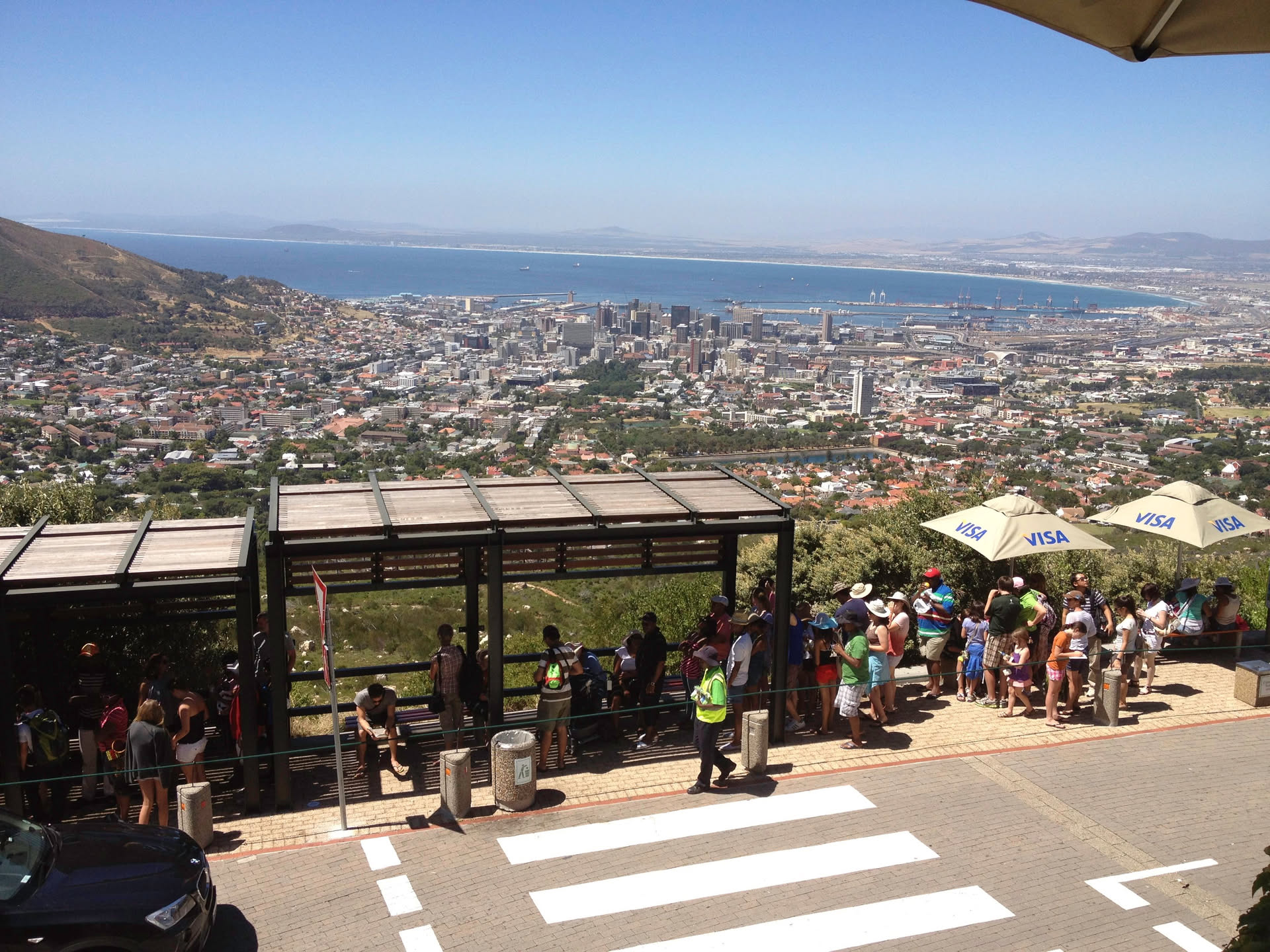 Op driekwart van de route schrikken we: er staat een bordje dat de kabelbaan gesloten is! Shit, eerst Robbeneiland, en nu dit. We staan even te kijken met wat andere mensen en dan zien we plotseling toch een gondel van de kabelbaan bewegen. Gelukkig.