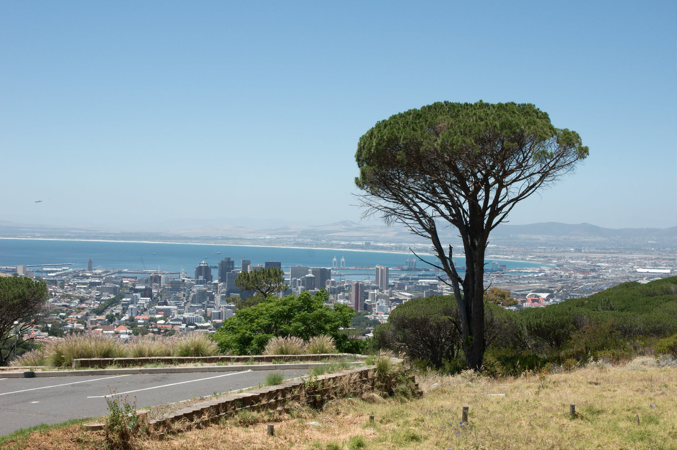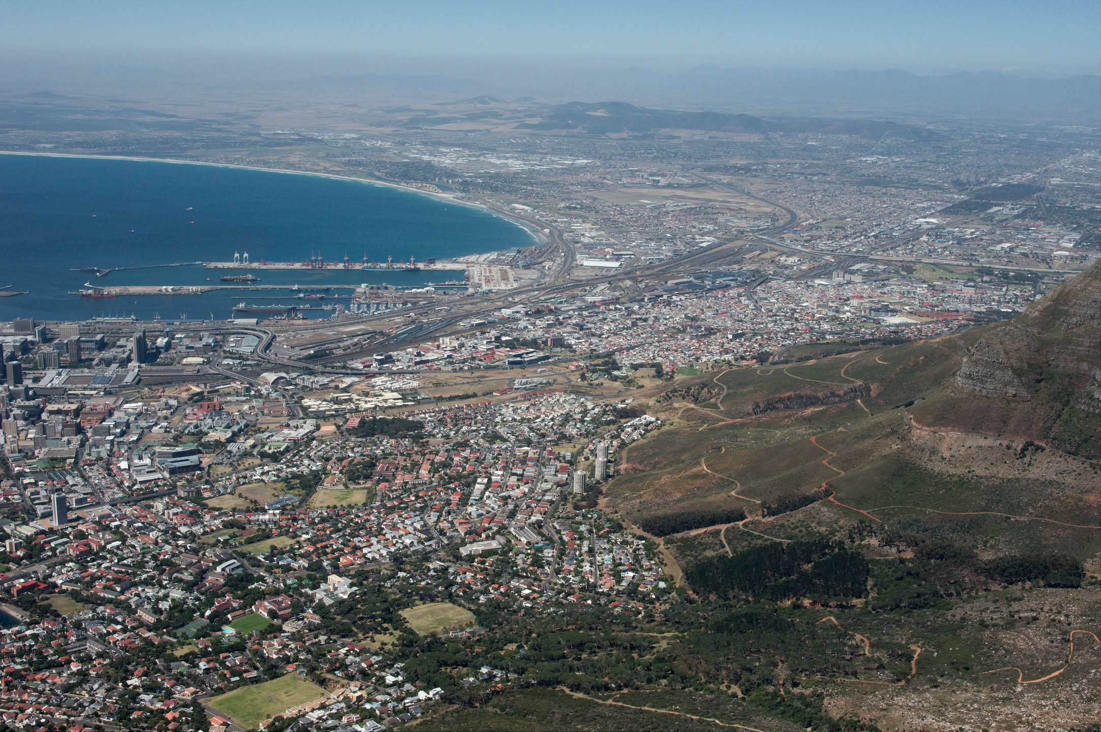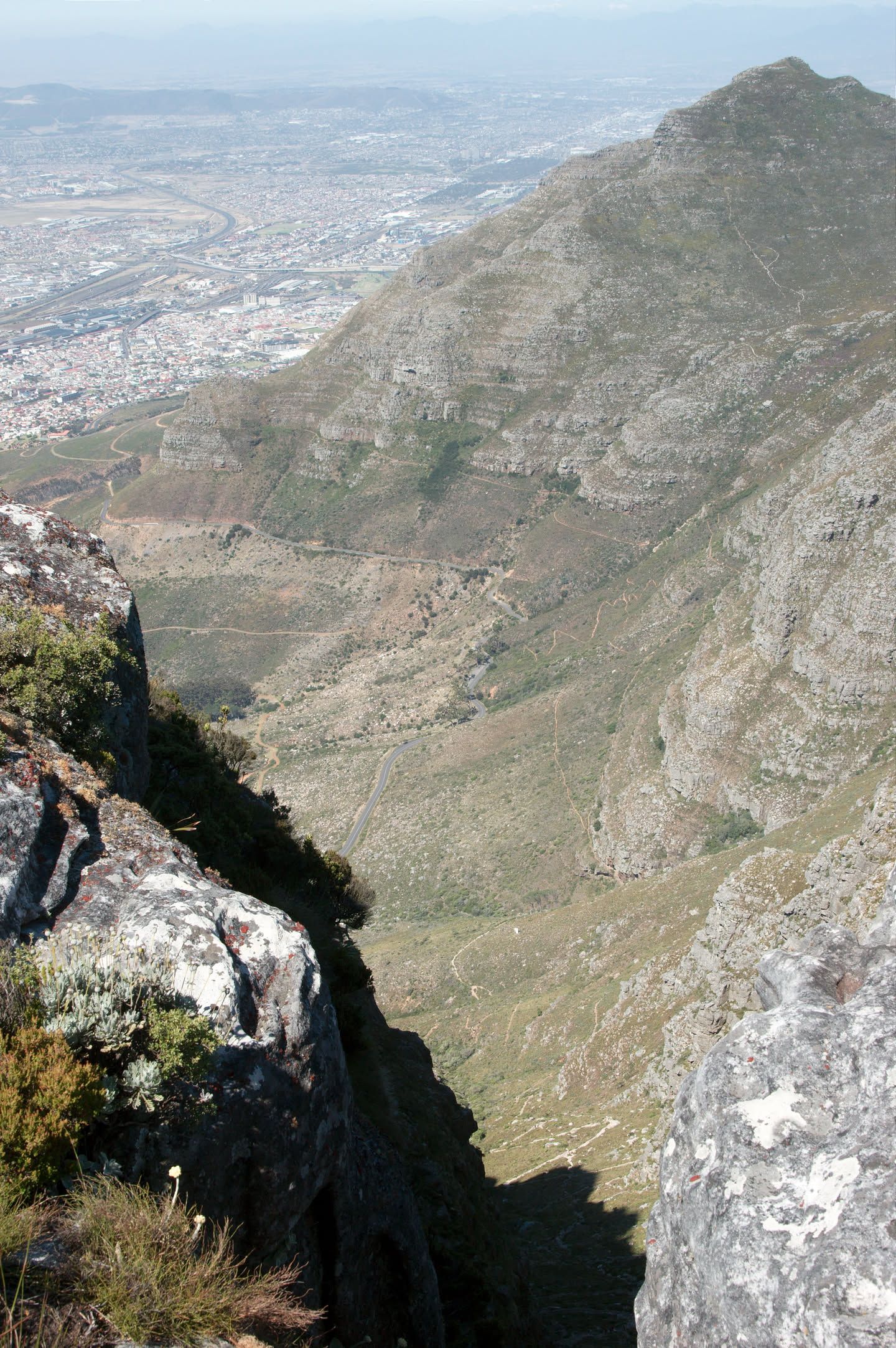 De tafelberg heeft vanaf de stad gezien een platte bovenkant, ik ben benieuwd of dat bovenop ook zo is. De berg is erg steil, gelukkig is er een kabelbaan die je naar boven kan brengen. Alleen begint de kabelbaan niet midden in de stad maar aan de voet van het steile gedeelte, omgeveer 350 meter boven de zeespiegel. Vol goede moed beginnen we aan de wandeling richting de kabelbaan, het wordt een zware tocht met behoorlijk steile stukken en het is erg warm vandaag. Onderweg heb je steeds een prachtig uitzicht over de stad en de haven.