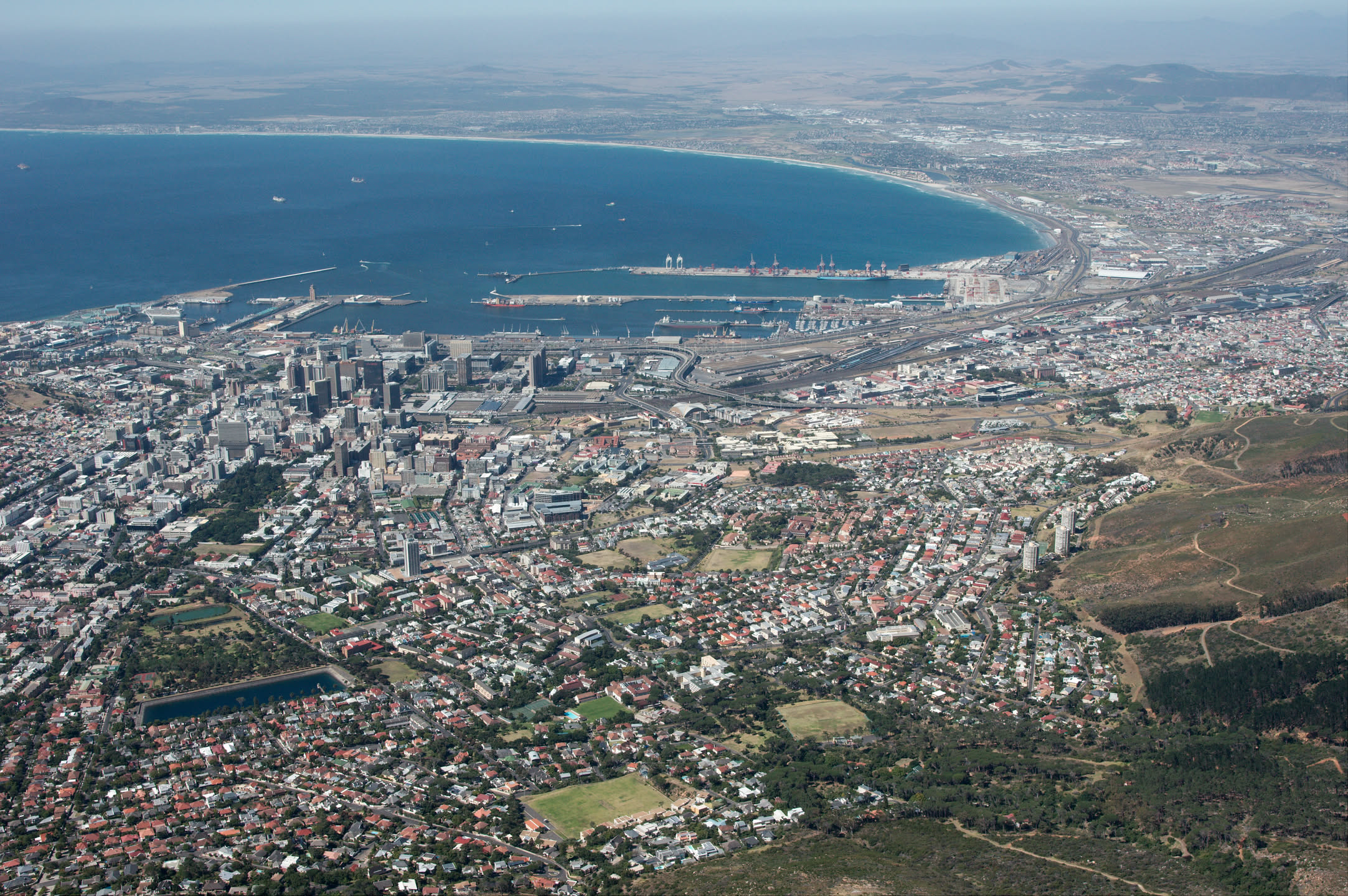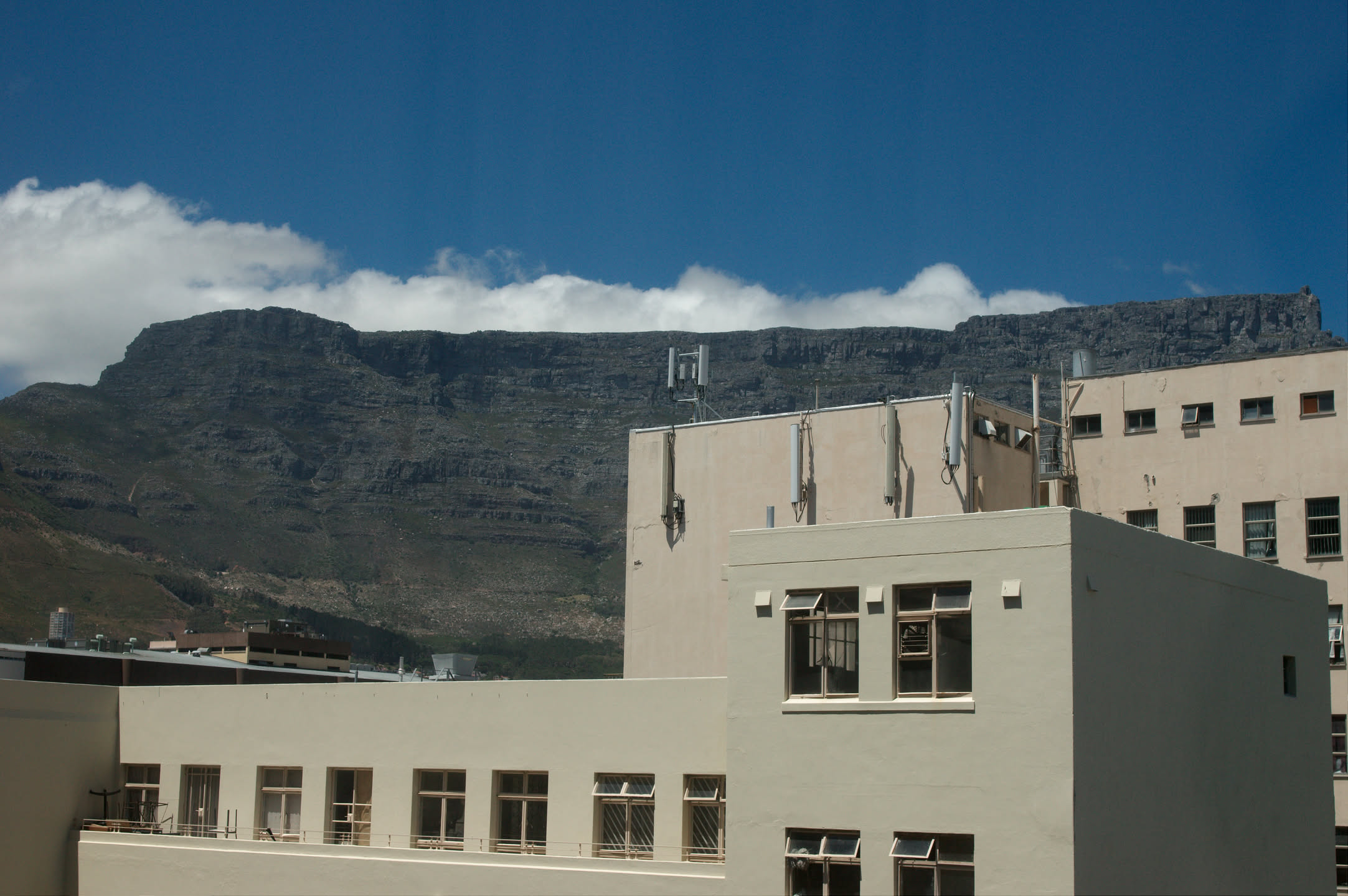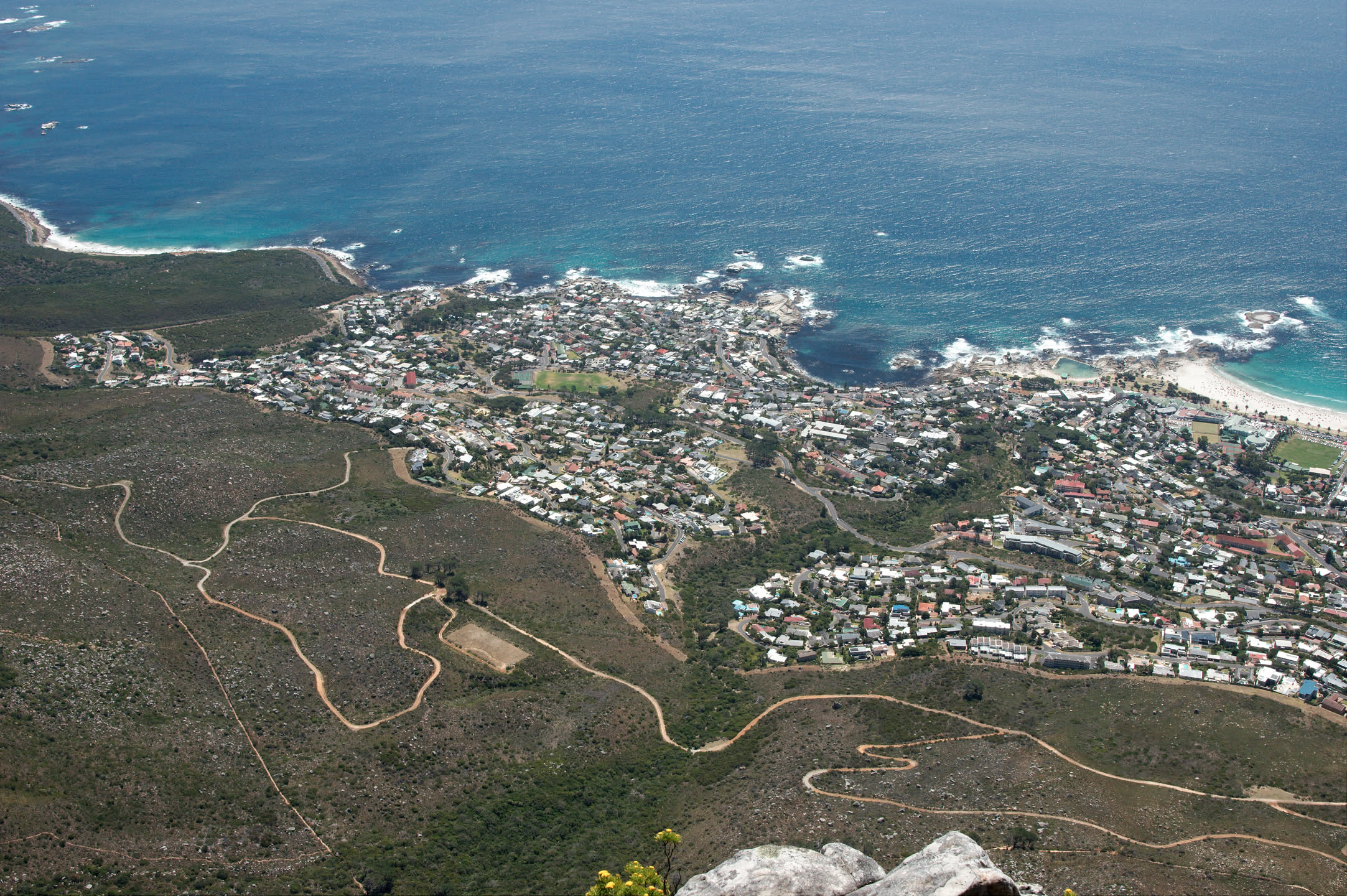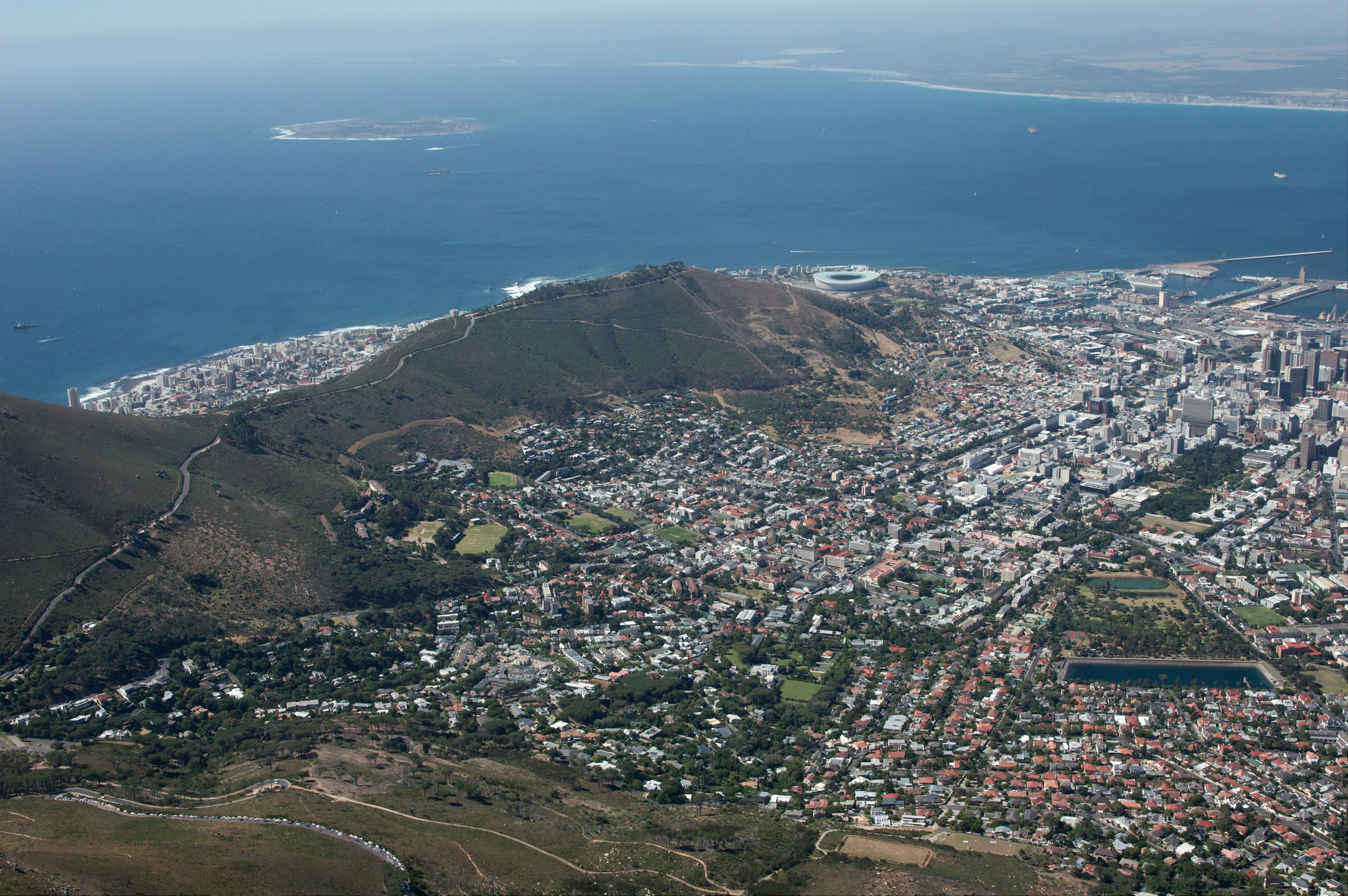 De tafelberg heeft vanaf de stad gezien een platte bovenkant, ik ben benieuwd of dat bovenop ook zo is. De berg is erg steil, gelukkig is er een kabelbaan die je naar boven kan brengen. Alleen begint de kabelbaan niet midden in de stad maar aan de voet van het steile gedeelte, omgeveer 350 meter boven de zeespiegel. Vol goede moed beginnen we aan de wandeling richting de kabelbaan, het wordt een zware tocht met behoorlijk steile stukken en het is erg warm vandaag. Onderweg heb je steeds een prachtig uitzicht over de stad en de haven.