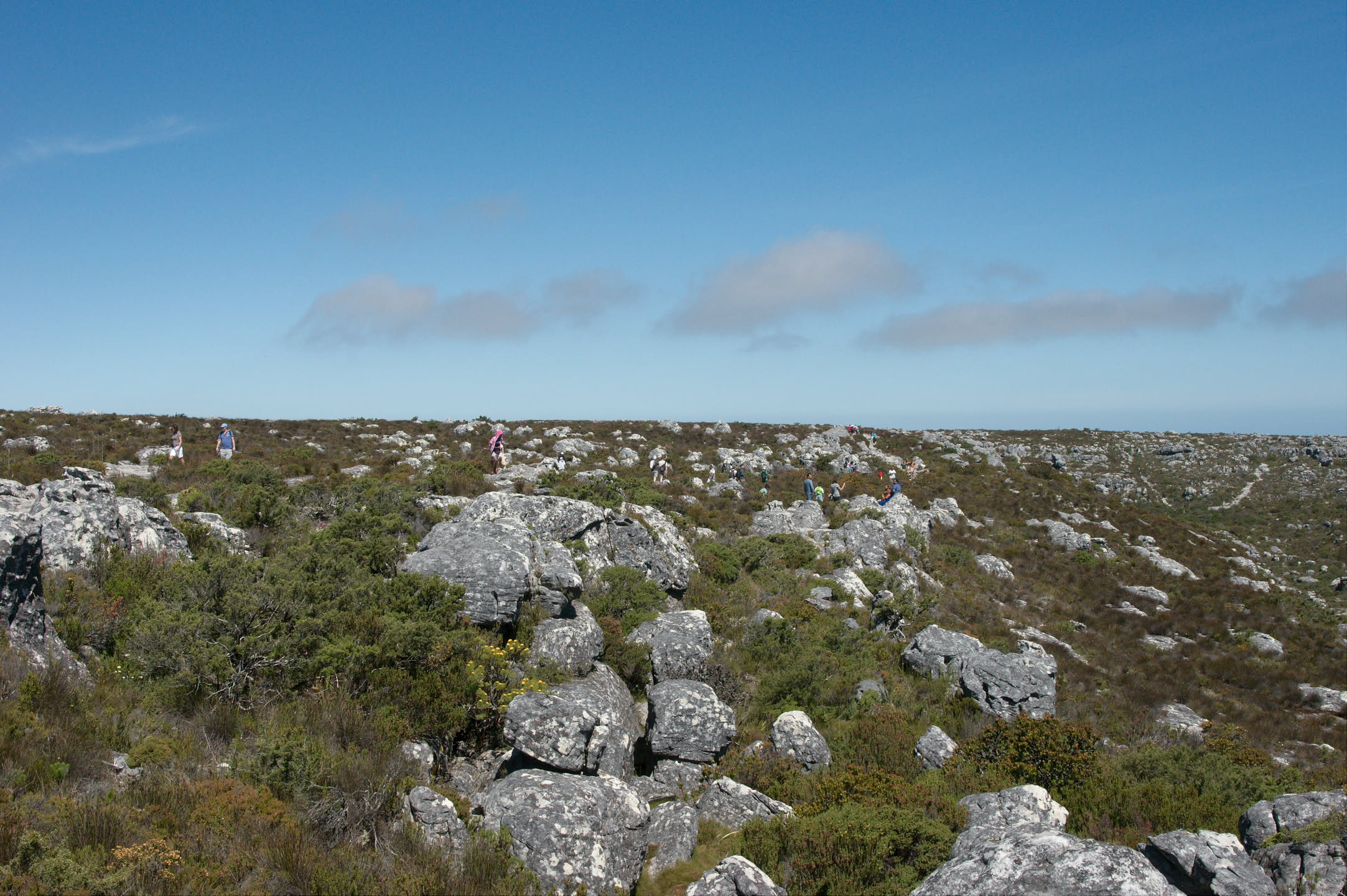 De bovenkant van de berg is redelijk vlak, en toch ook weer niet, het is vlak in de zin dat het verschil tussen het hoogste en laagste punt maar een meter of 30 is; het is niet vlak omdat er allemaal steenbulten liggen wat het wandelen nogal lastig maakt.