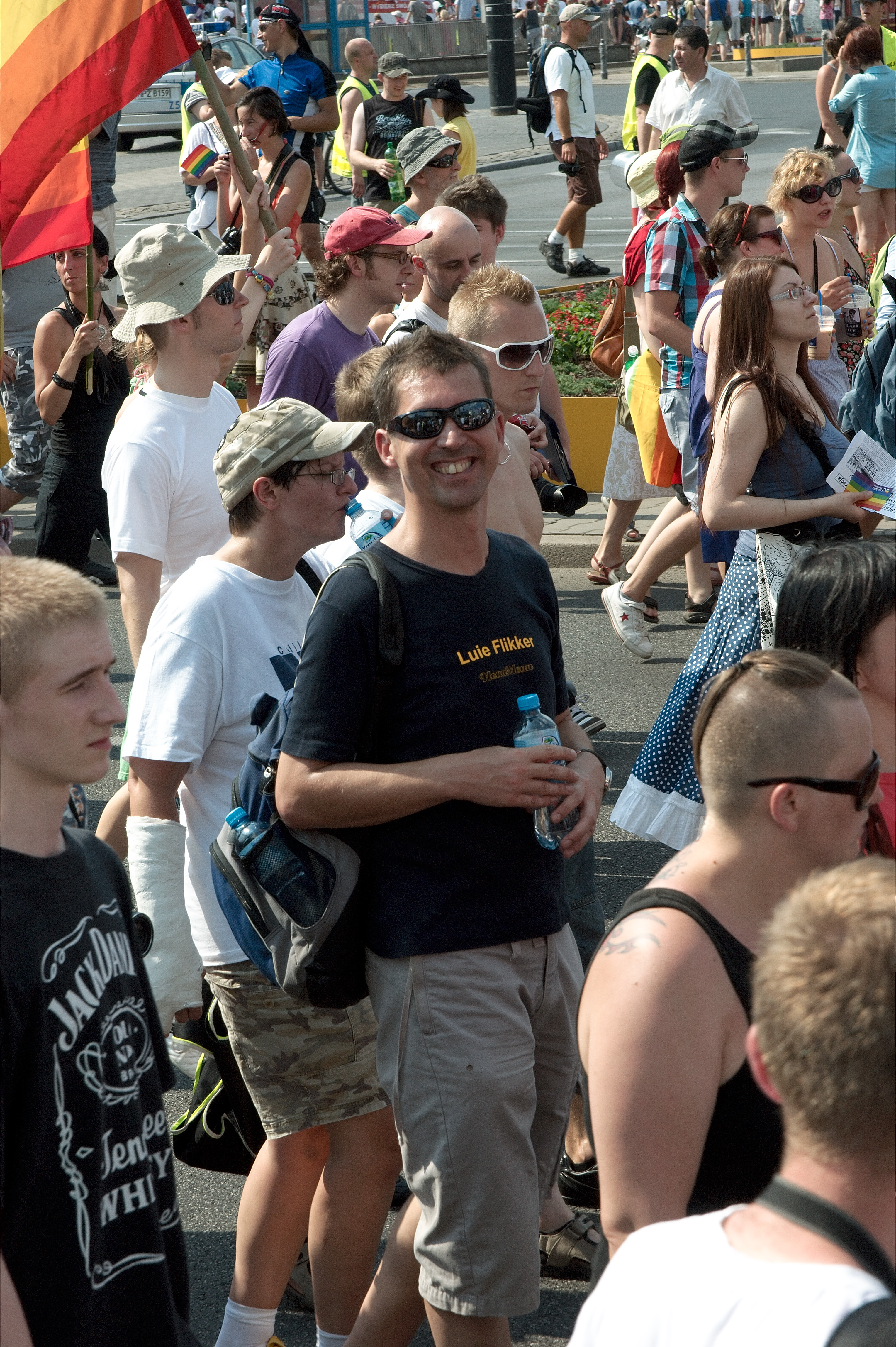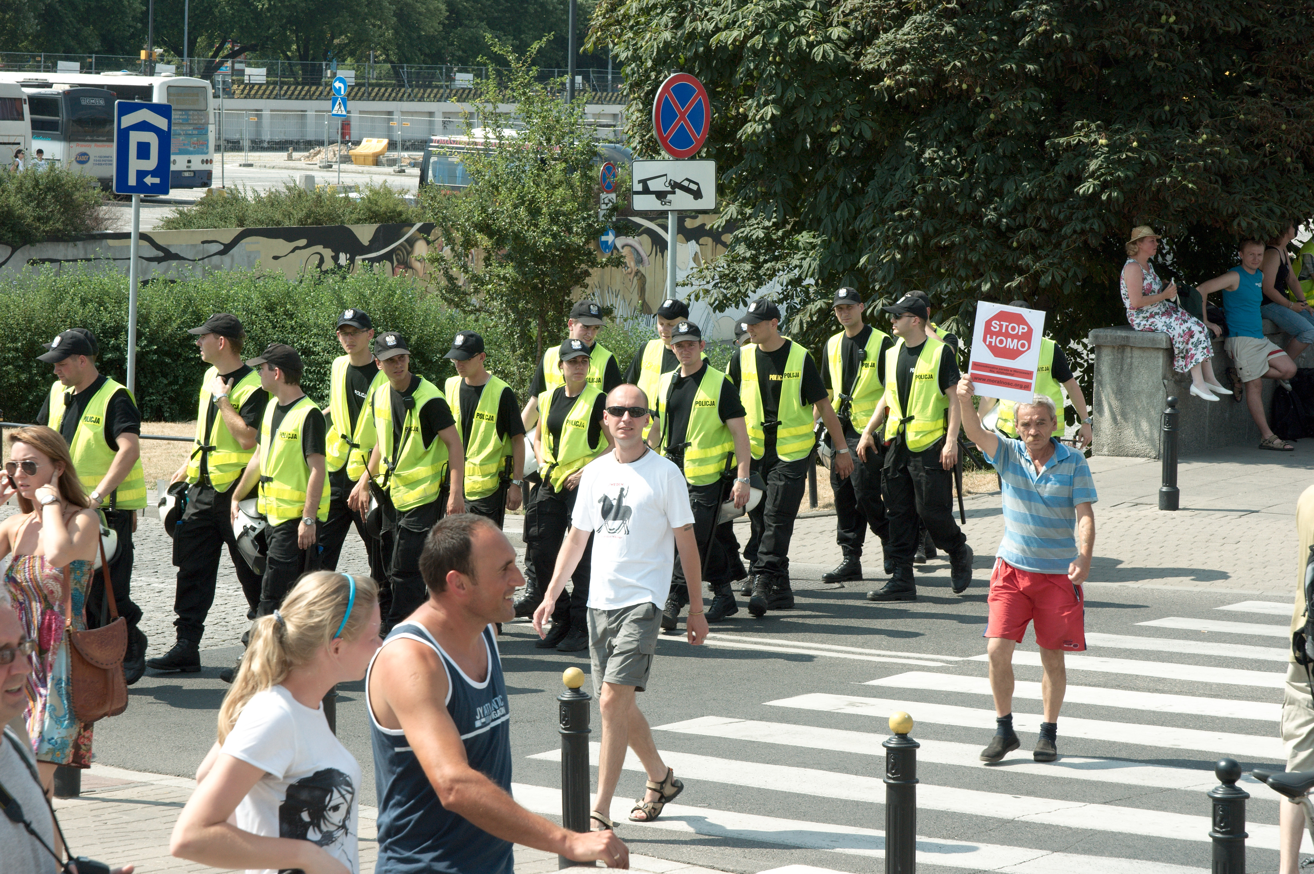 De tocht verloopt verder zonder incidenten; wel opvallend veel groepjes en personen die tegen homosexualiteit demonstreren, bijvoorbeeld met bordjes ‘Stop Homo’.
