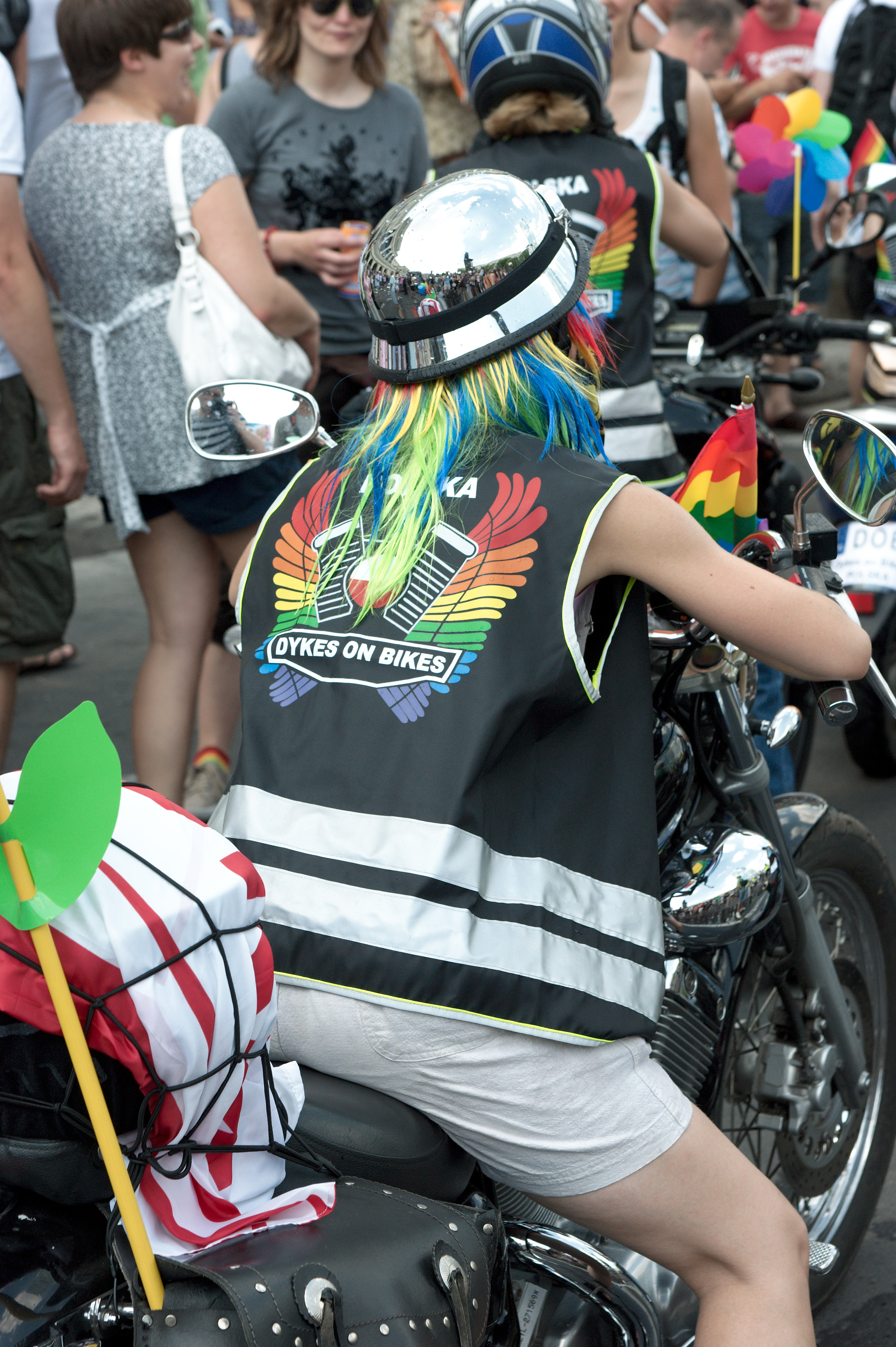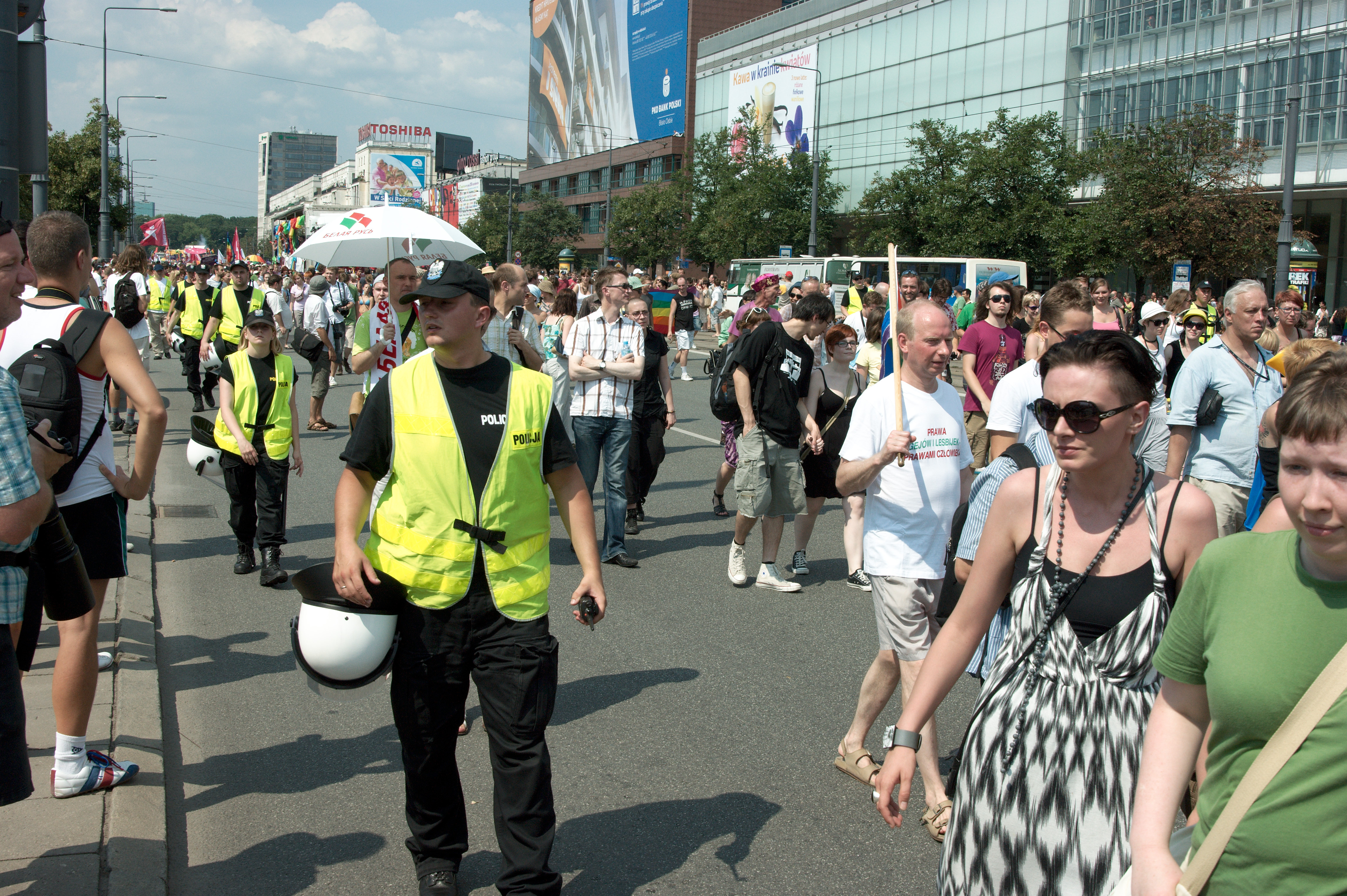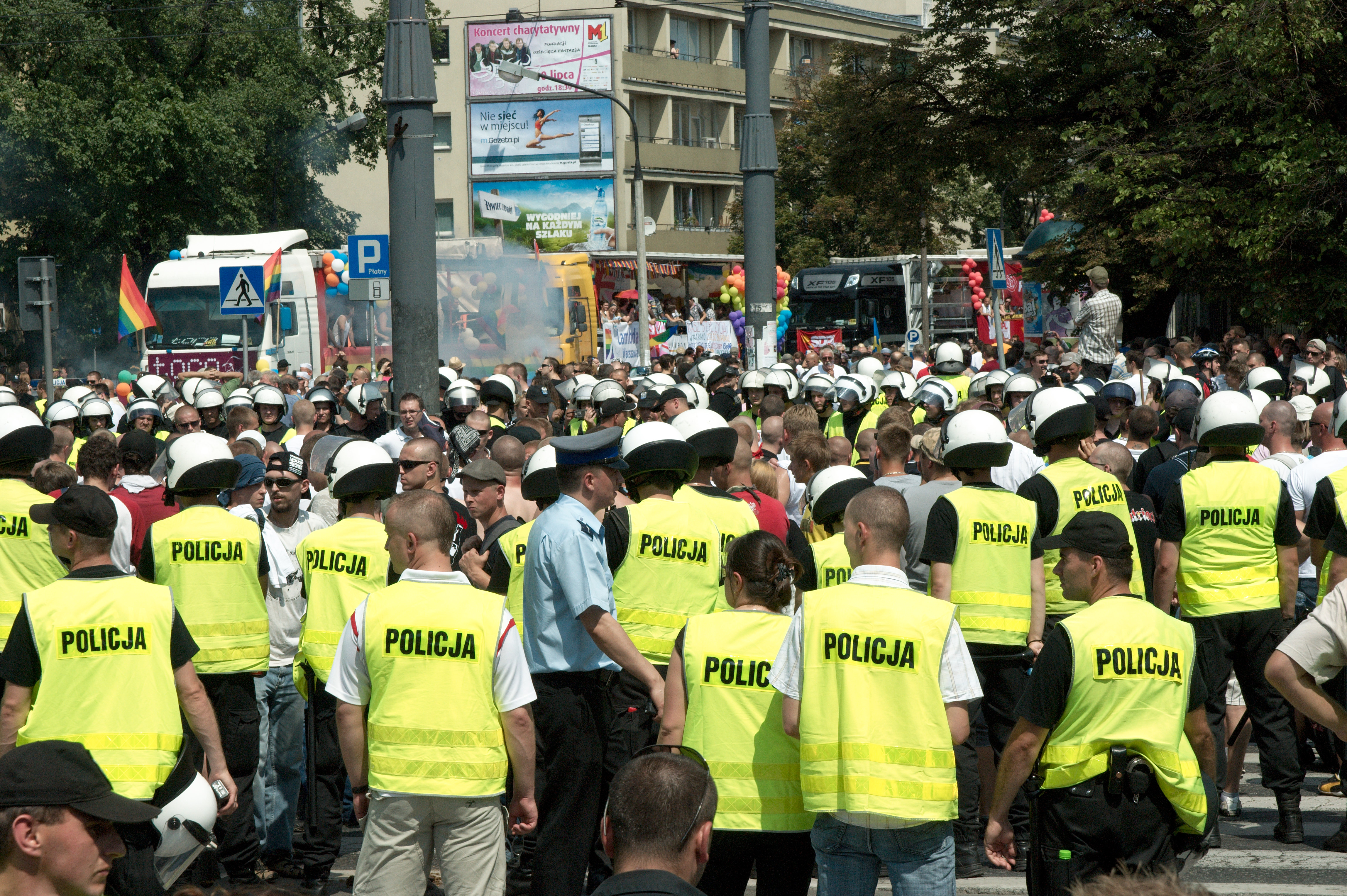 De dag begint goed, het plein waar de parade gaat starten loopt lekker vol. De omgeving is compleet omringd door veiligheidsmensen in gele hesjes, je vraagt je echt af: moet dat nou? Bij een roze zaterdag is uiteraard ook beveiliging op straat, maar het staat niet in verhouding tot de hoeveelheid die hier in Warschau is. En even later is ook duidelijk waarom: een stel relschoppers komt aanstormen en begint met van alles en nog wat te gooien. Maar binnen de kortste keren zijn de relschoppers omsingeld door de mannen in de gele hesjes, en kunnen ze niks meer. Zo lang de parade nog niet van het plein af is blijven de omsingelde relschoppers op de rand van het plein – ze mogen protesteren en scanderen, maar gooien en vechten wordt ze onmogelijk gemaakt.