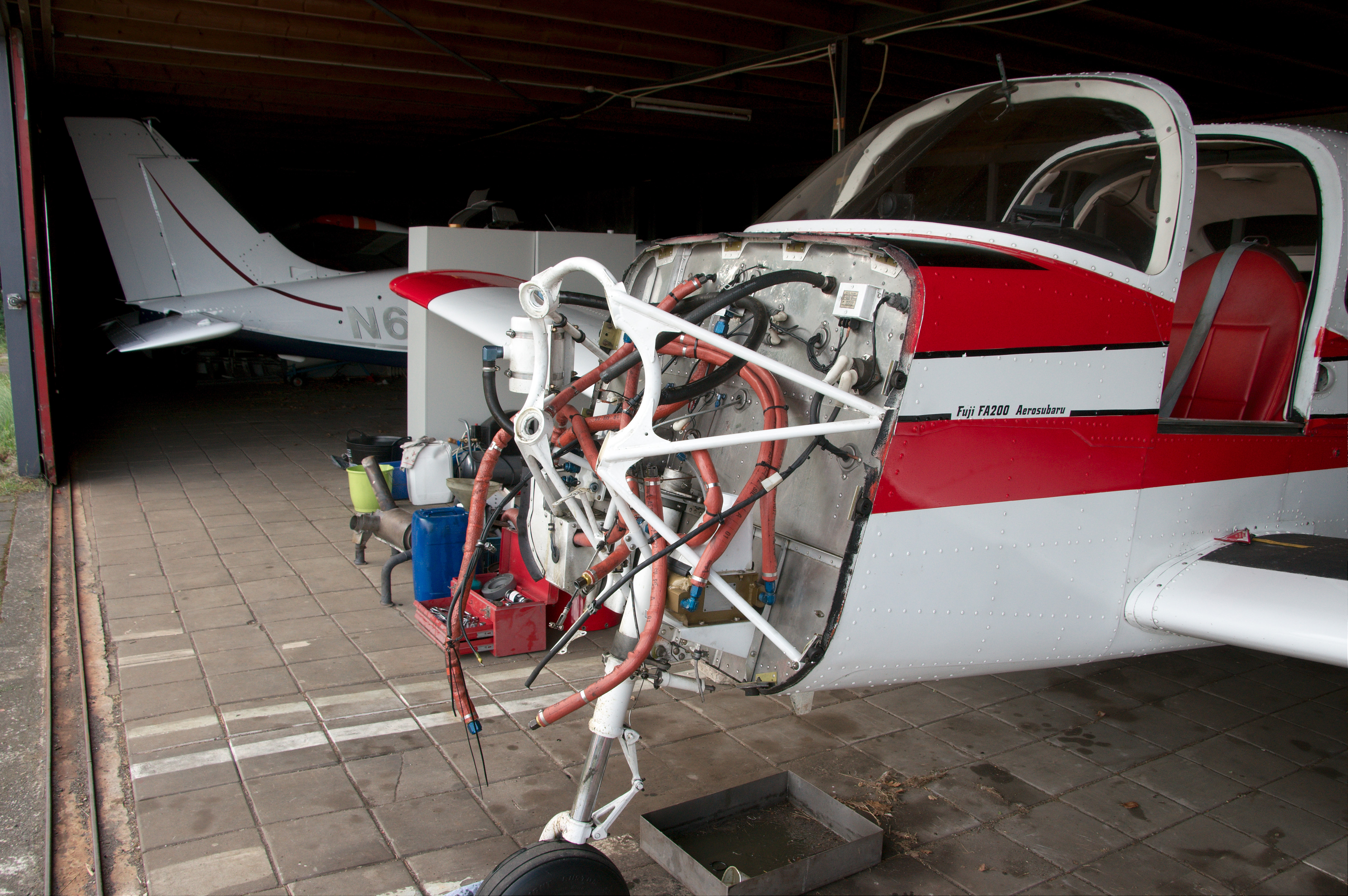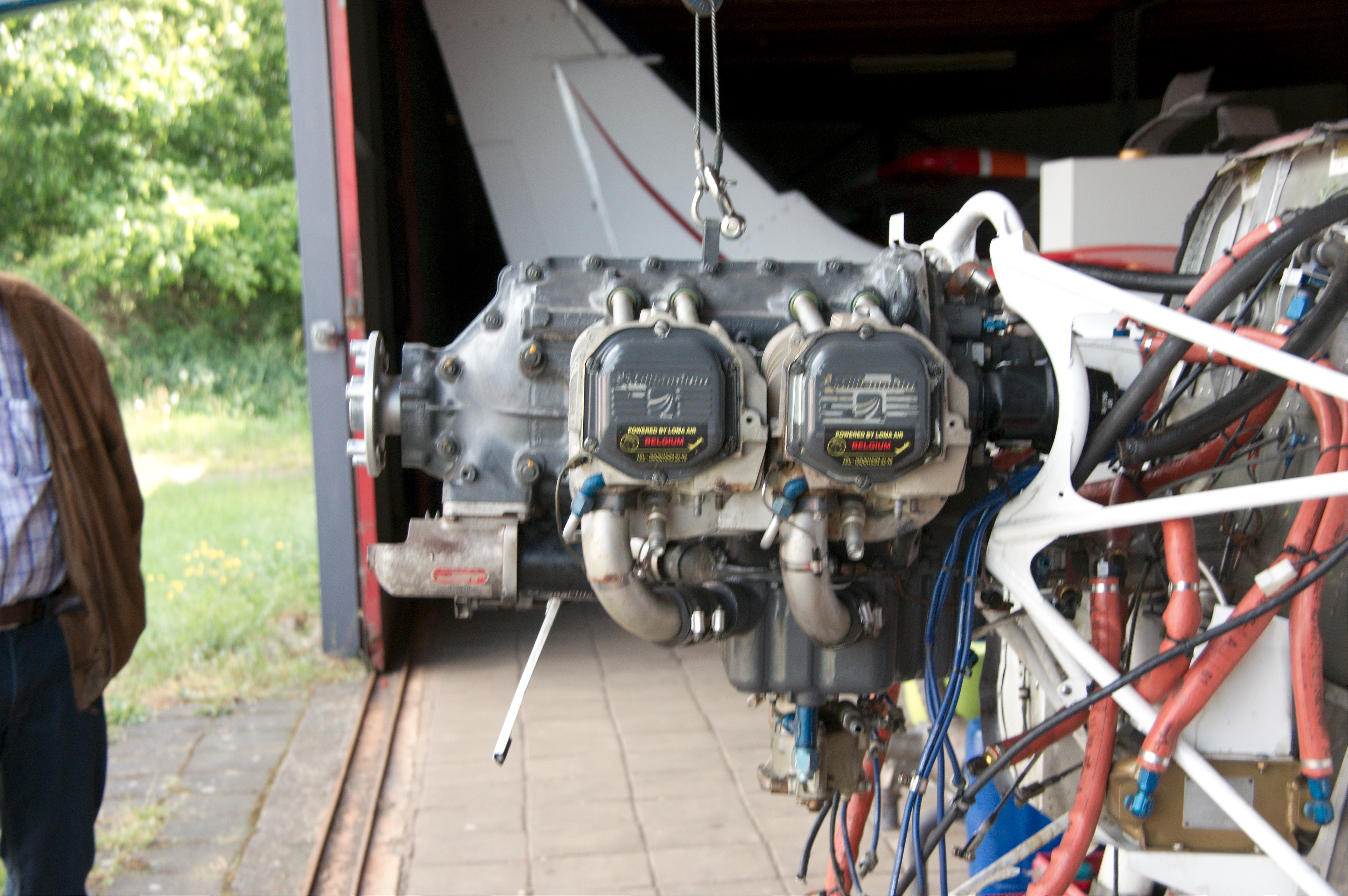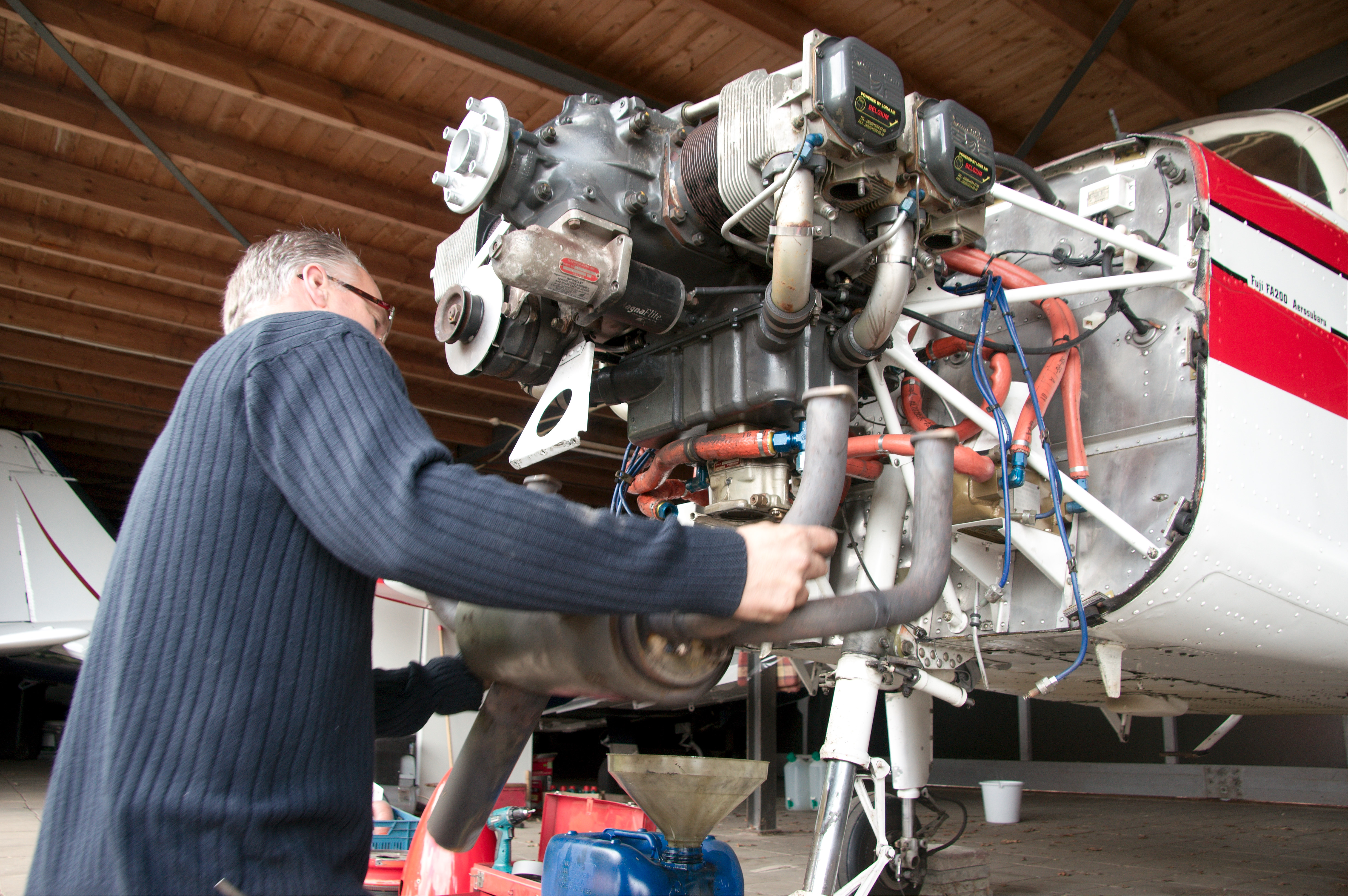 In het midden het olieverzamelvat, linksonder het witte geval met de drie aansluitingen is het oliesysteem die op-de-kop vliegen mogelijk maakt (inverted system)