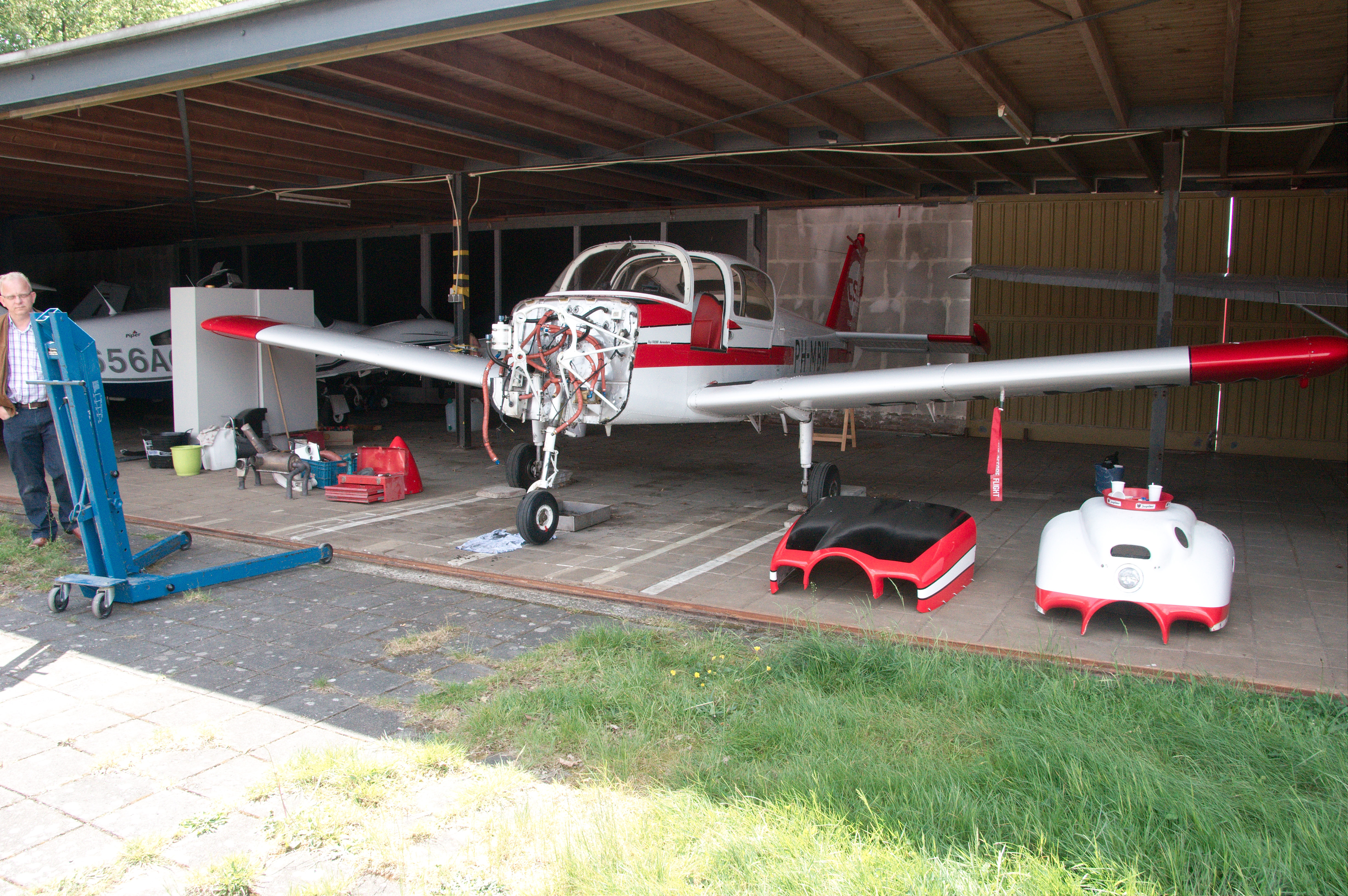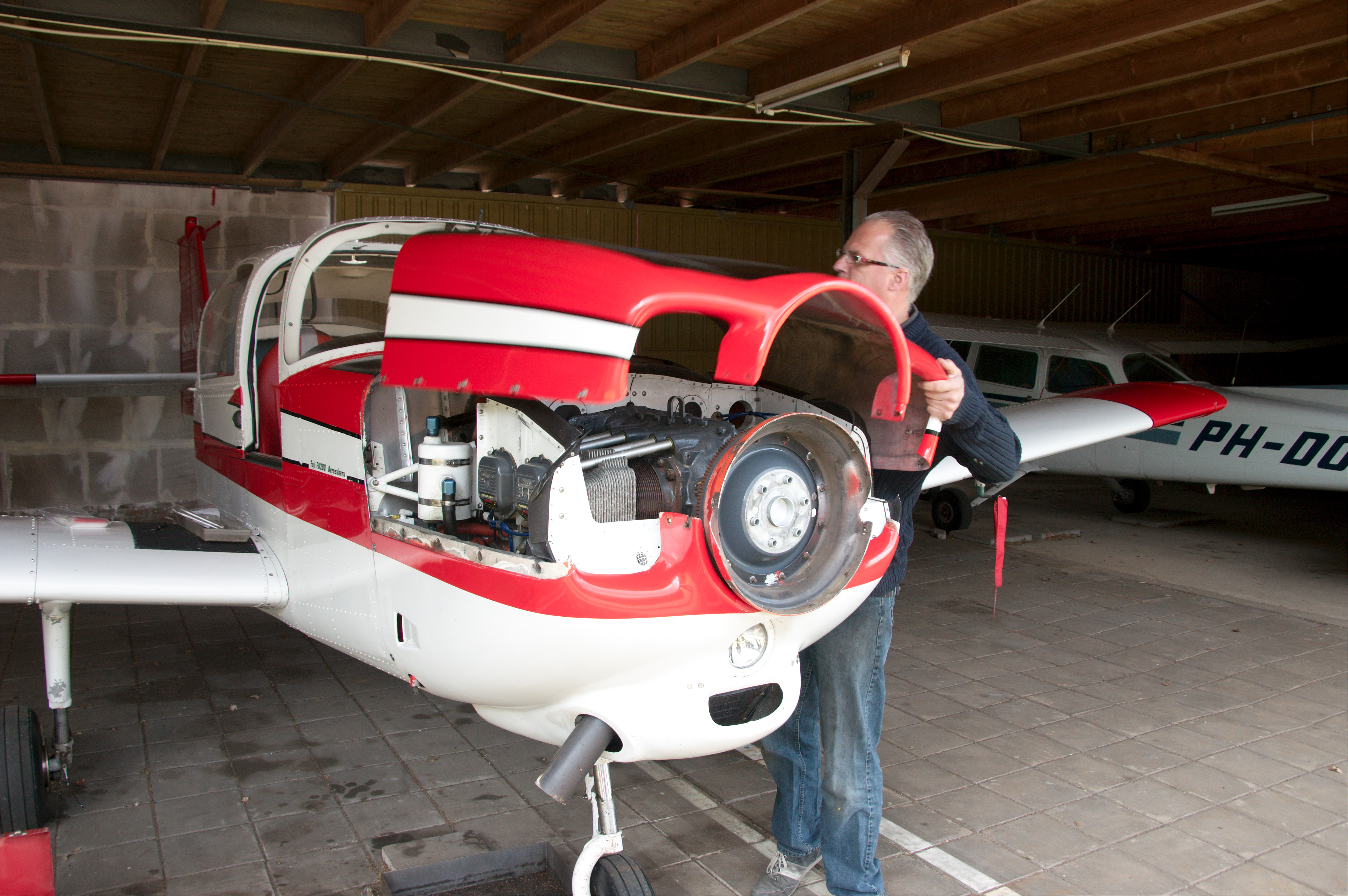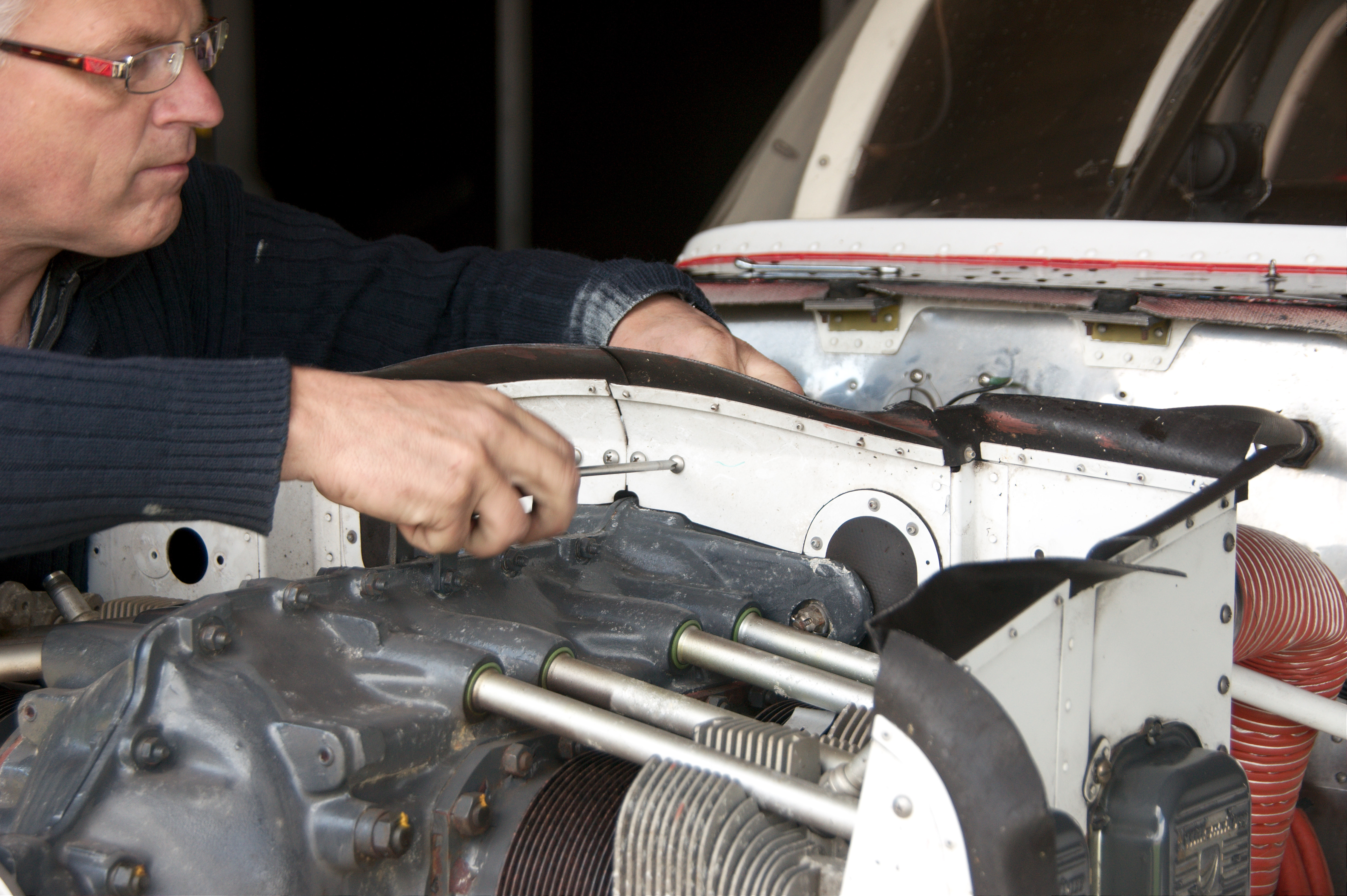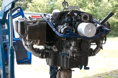 In het midden het olieverzamelvat, linksonder het witte geval met de drie aansluitingen is het oliesysteem die op-de-kop vliegen mogelijk maakt (inverted system)