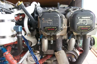 Cylinder met al zijn aansluitingen; je ziet ook de 2 bougies aansluitingen per cylinder, 1 boven en 1 onder