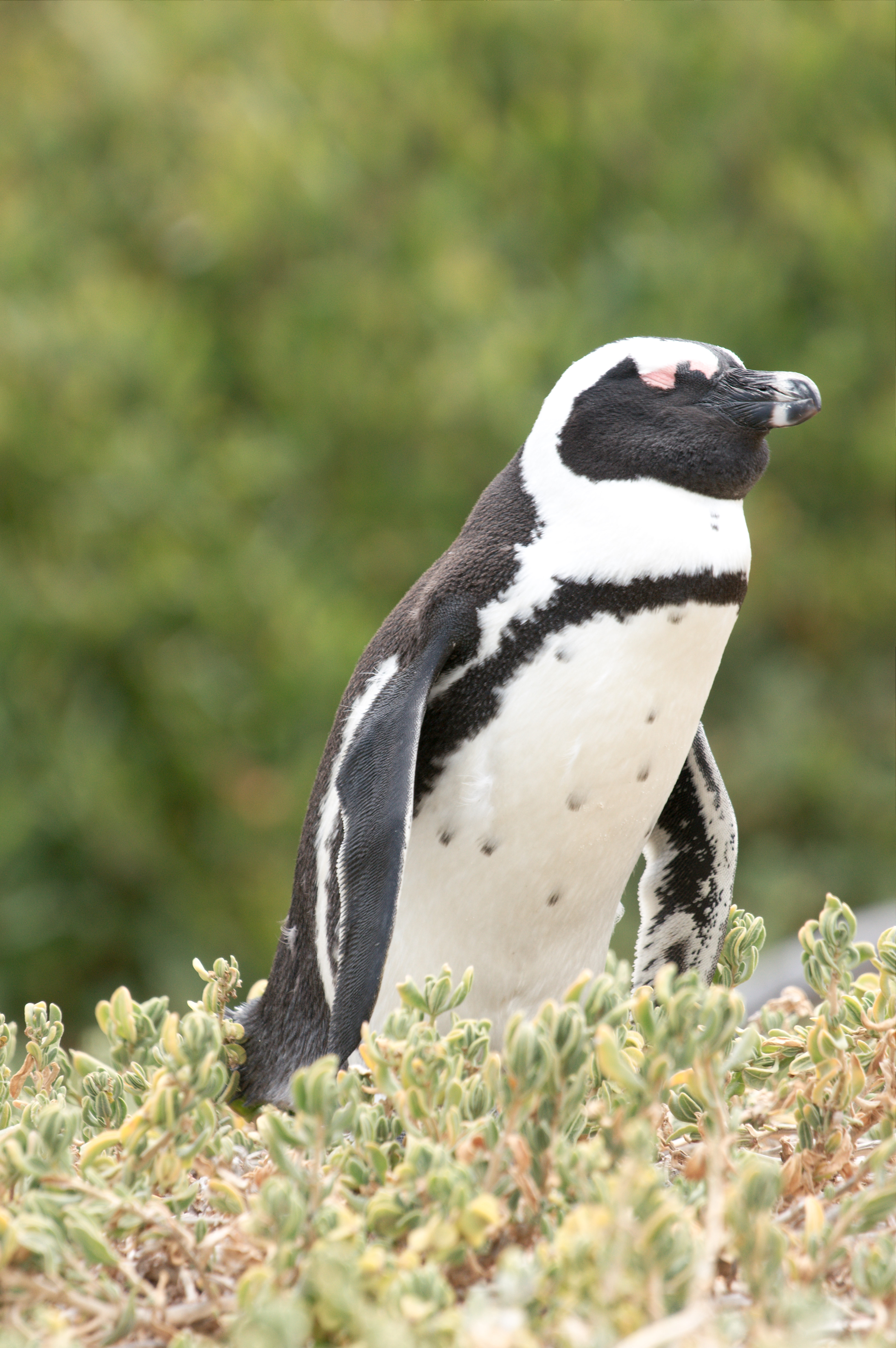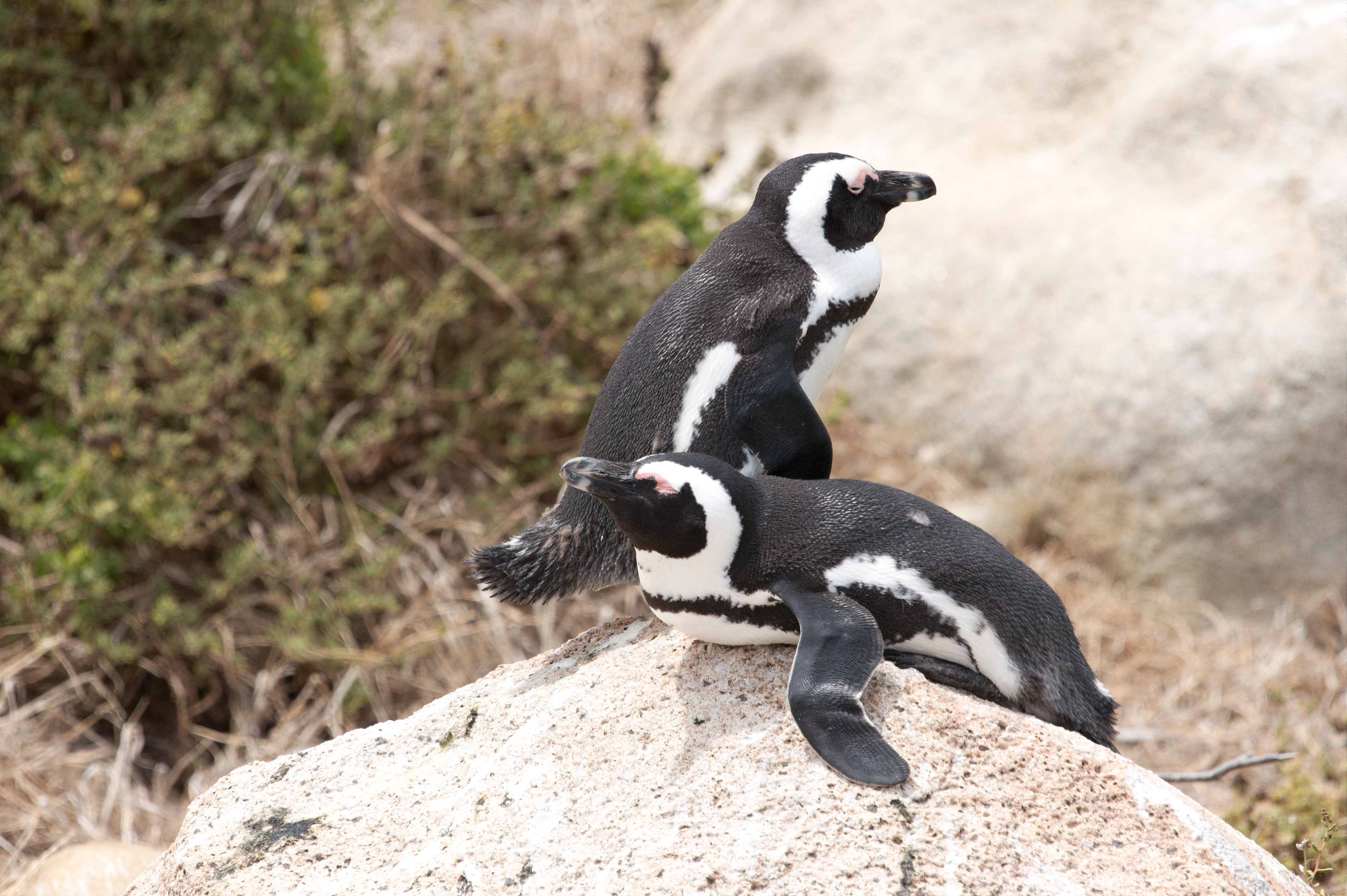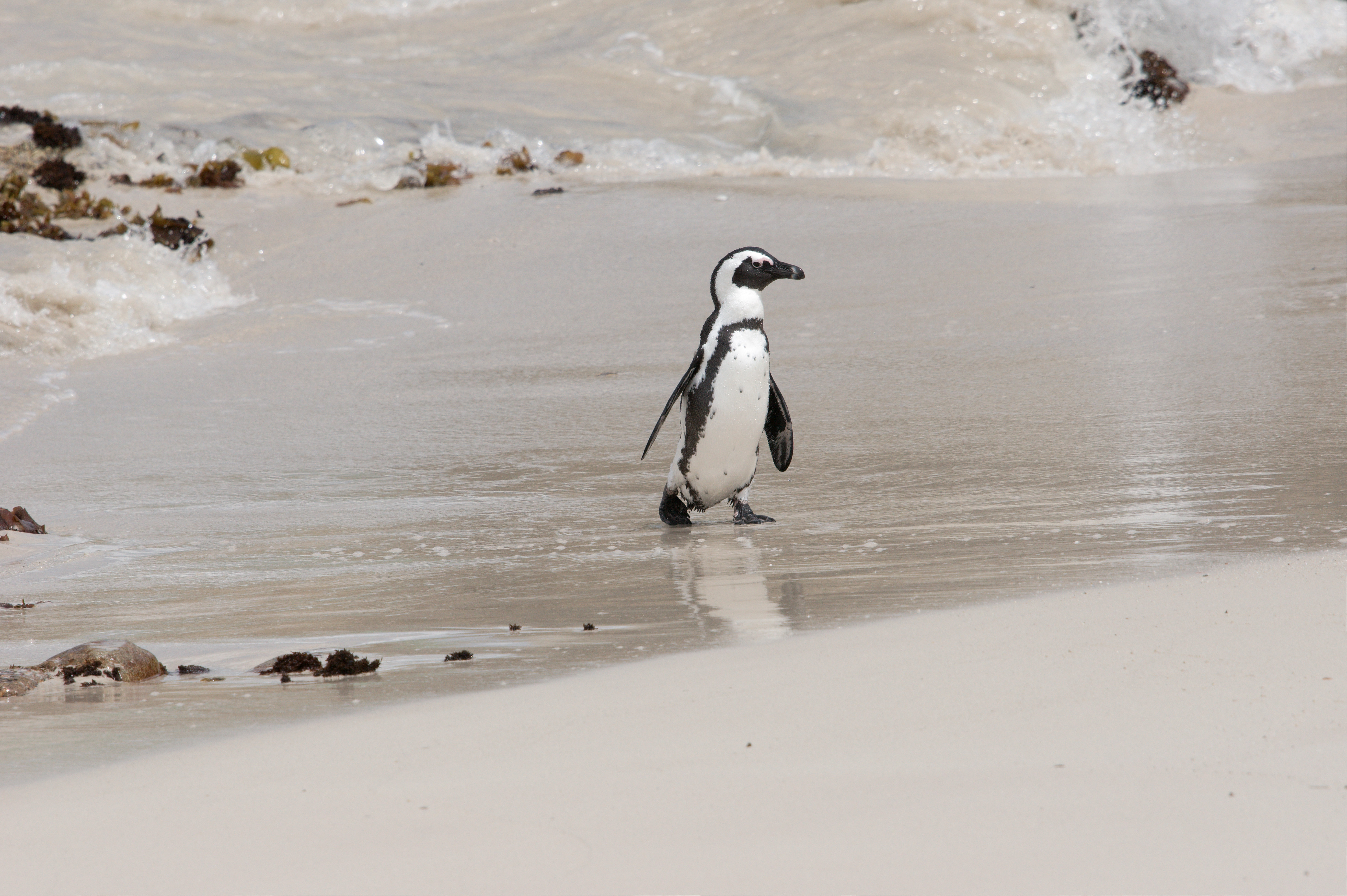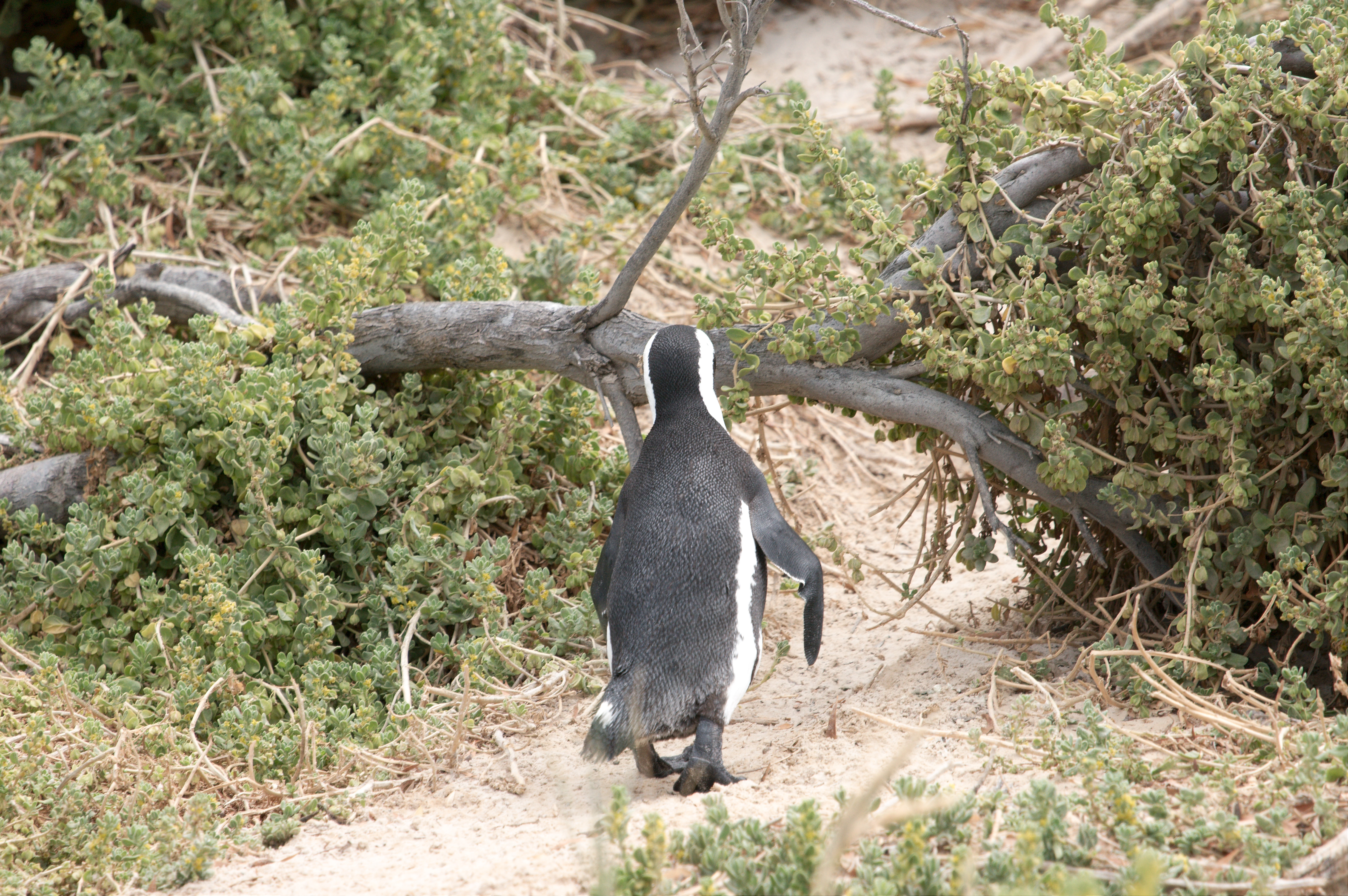 Onderweg naar de kaap woont nog een pinguïn familie, we gaan er even kijken. Het is een ander soort dan we zagen in Betty’s Bay, dezen waren ook wat beweeglijker; we hebben ze uit zee zien komen. De pinguïns komen niet als een eend aanzwemmen maar komen van onder water zo ongeveer het strand op lopen. Erg leuk om te zien.